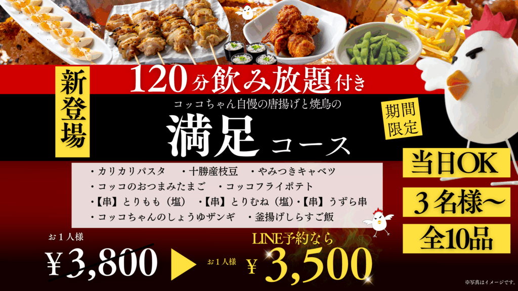 飲み放題120分付き全10品3,800円!「いただきコッコちゃん」にて当日OKの宴会コースを期間限定販売