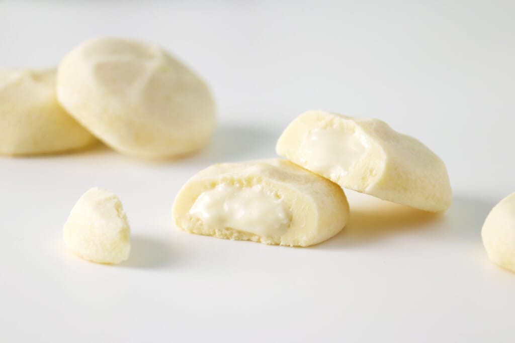 あさぎり牛乳、静岡県産練乳と生クリームを練り込んだ“さくほろ”クッキー生地に、全粉乳入りのとろけるミルクチョコクリーム入り。