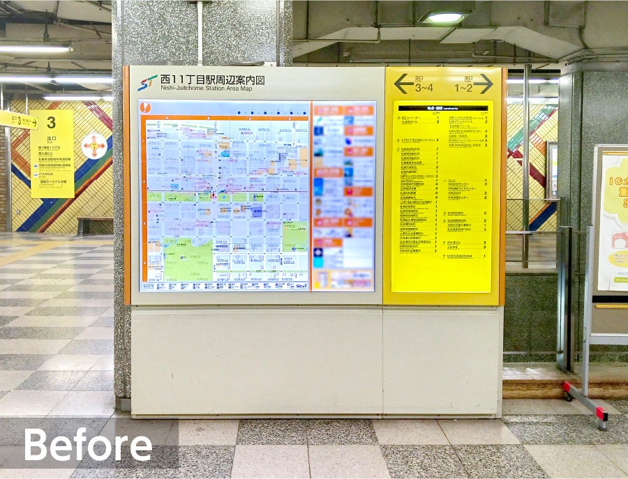 周辺案内地図の掲出などを展開する表示灯株式会社は、2025年4月から2026年3月の一年を通して、札幌市交通局全49駅のうち、約4割にあたる19駅に設置された29台の広告付き周辺案内地図「ナビタ」をリニューアルしました。