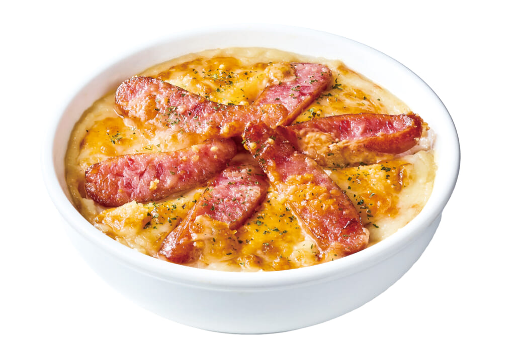 パリッとジューシーなたっぷりソーセージとチェダーチーズの濃厚なドリアです。