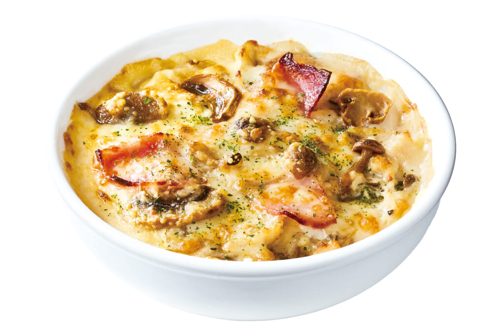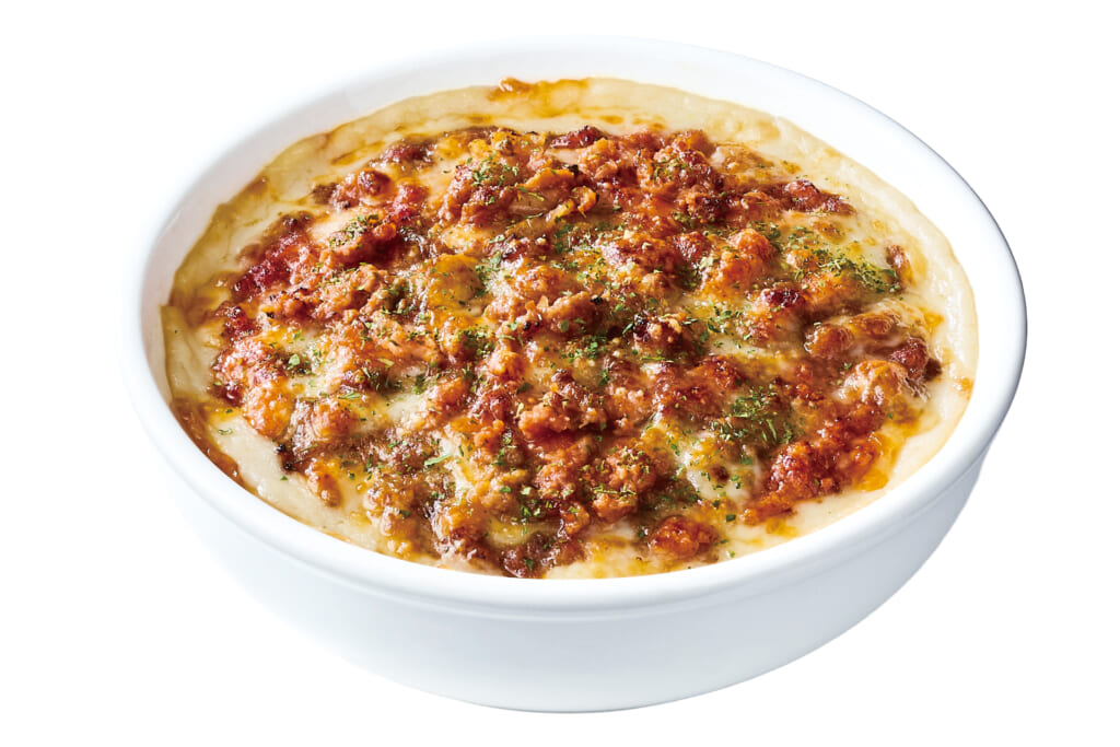 ホワイトソースとこんがり焼けたチーズ、特製ミートソースパスタが絡む味わい深いグラタンです。