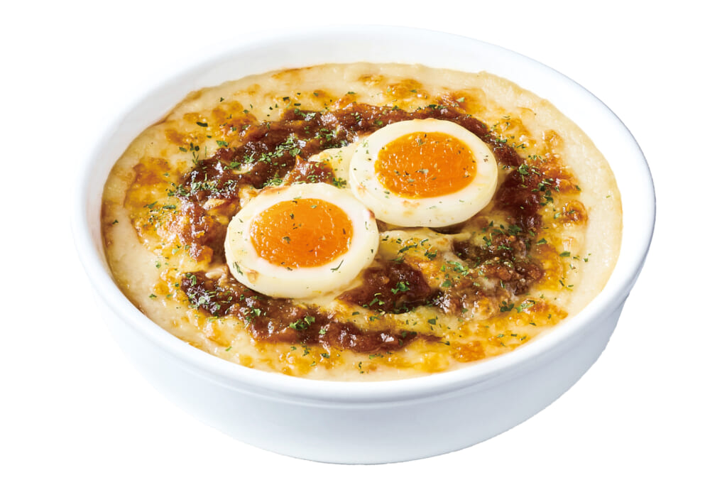 本格カレーソースとこんがり焼けたチーズがベストマッチ。さらに卵とあわせると濃厚なおいしさに。