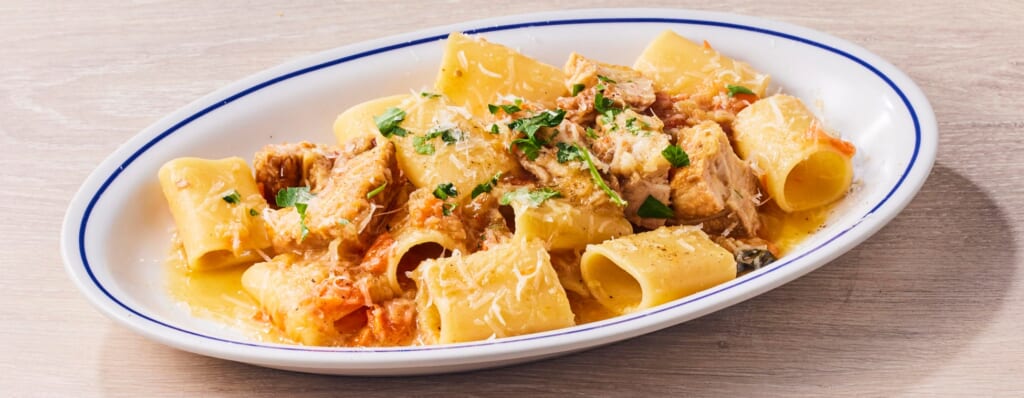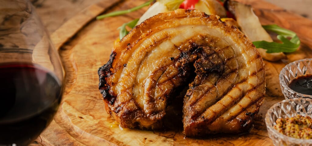 酒蔵・高砂酒造の酒粕を飼料に取り入れて育てた牛。ナポリ風ジェノベーゼなどで提供。