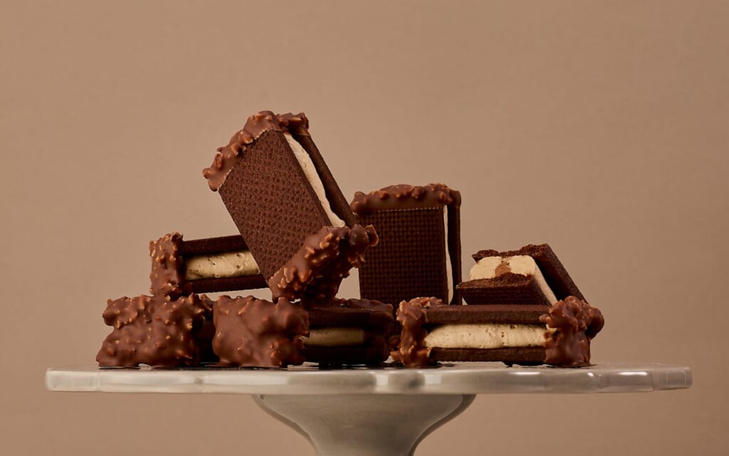 砕いたアーモンドがたっぷり入ったミルクチョコレートで側面をコーティング。香ばしくローストしたアーモンドがザクザクな食感を叶えます。