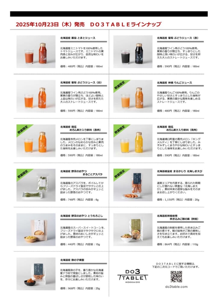 JR北海道フレッシュキヨスク株式会社は、2025年10月23日(木)より、「DO3TABLE(ドーサンテーブル)」に新たな果汁飲料を加え、昨年好評だった『北海道根室産 まるかじり北海しまえび』を含む 11 商品を発売します。