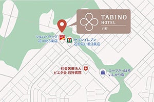 「たびのホテル石狩」は、車で札幌市中心部から約30分、新千歳空港から約1時間と、道内外からのアクセスに優れた場所に立地しています。市役所まで徒歩圏内にあり、ホテル周辺にはコンビニエンスストアやドラッグストア、スーパーマーケット、病院や中央郵便局が揃っており、また、「コストコ石狩倉庫店」へも車で約7分と、長期滞在にも適した環境が整っています。また、ホテル敷地内には110台収容可能な無料平面駐車場を完備しており、車でお越しの方も安心して利用できます。