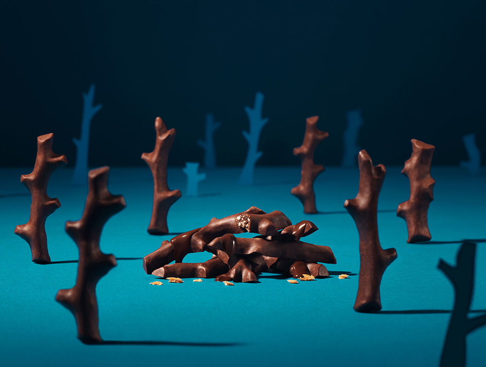 薄く焼いたクレープ生地を砕いたフィアンティーヌと、ローストアーモンドを細かく刻み、香ばしいパイを混ぜ込んだ、サクサク食感も楽しめるクリスピーチョコレートです。ミルクチョコレートとスイートチョコレートの絶妙なブレンドでミルキーな味わいをお楽しみいただけます。版画家 大谷一良さんの作品「森の見る夢」の木々をモチーフにした3つの形のチョコレートが特徴です。
