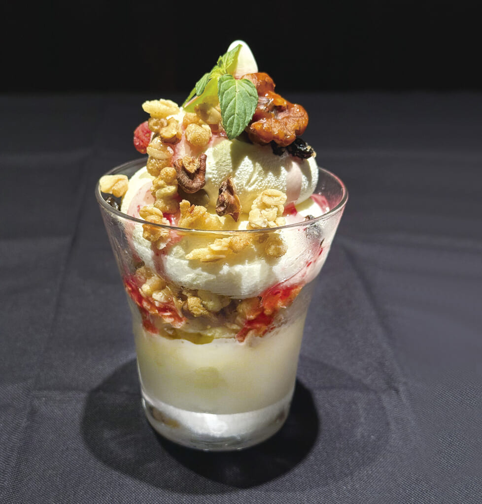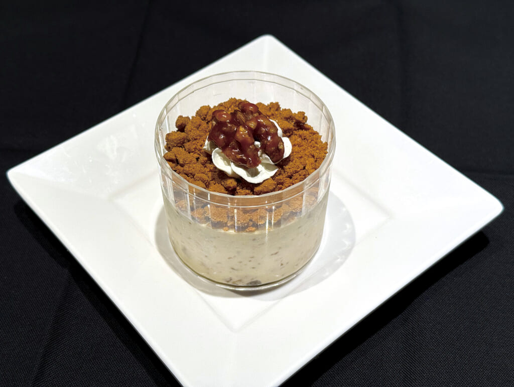 イタリア菓子・ズコットに使われるマスカルポーネのチーズムースにくるみとチョコチップを和え、クッキークランチとくるみのキャラメリゼをトッピングしました。