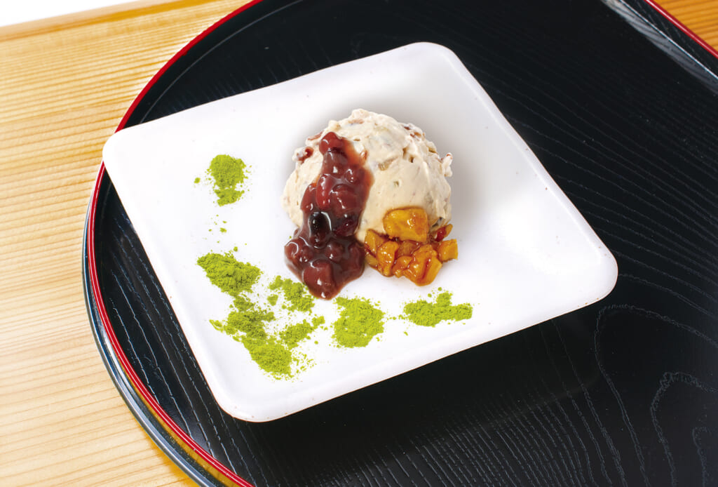 マスカルポーネアイスと北海道ソフトクリームにフルーツグラノーラとローストしたくるみをトッピング。キャラメリゼした甘みのあるくるみが相性ばっちりです。