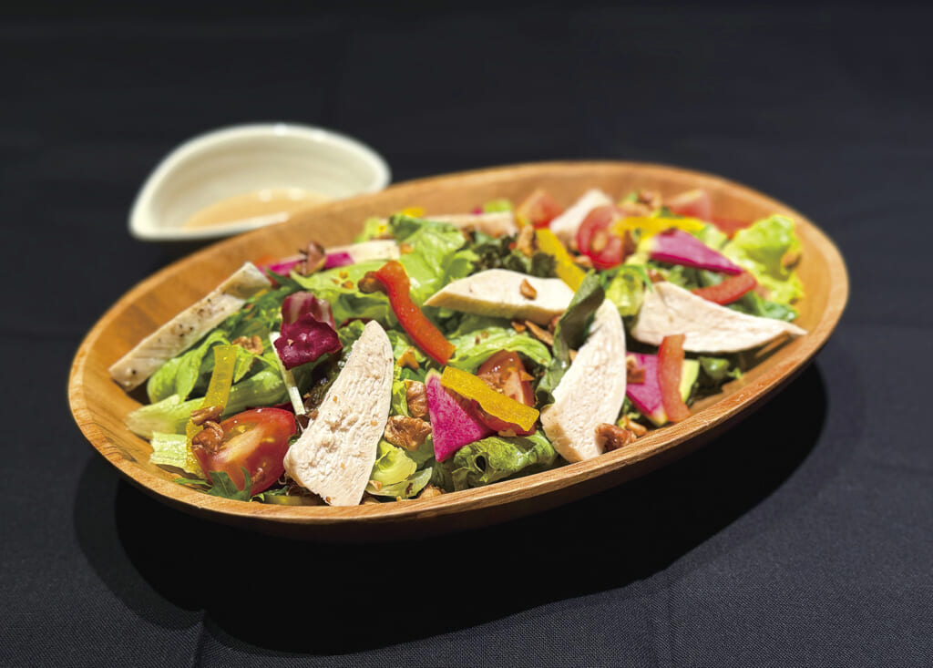 国産鶏胸肉の蒸し鶏とローストくるみを、彩り野菜にトッピングしました。自家製のくるみドレッシングは酸味の効いたさっぱりタイプとなります。