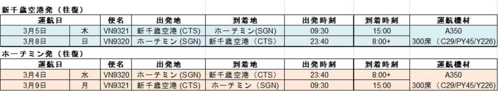 ベトナム航空は、2026年3月5日(木)および 3月8日(日)の2日間、北海道・新千歳空港=ベトナム・ホーチミン(タンソンニャット国際空港)間の直行チャーター便を運航することを決定しました。