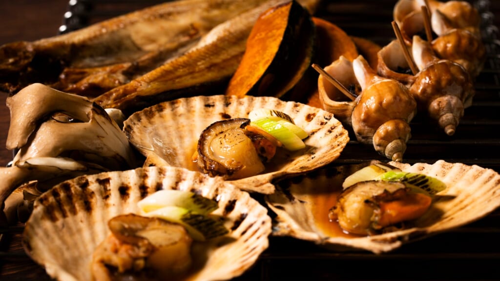 - 「炉端焼き風 北海道近海の恵みとホタテの殻焼き」