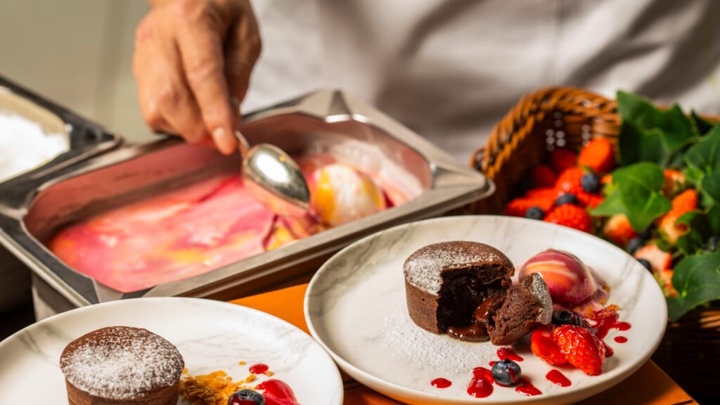 - 「焼き立ての温かいフォンダンショコラと北海道食材を使ったジェラートを一皿に」