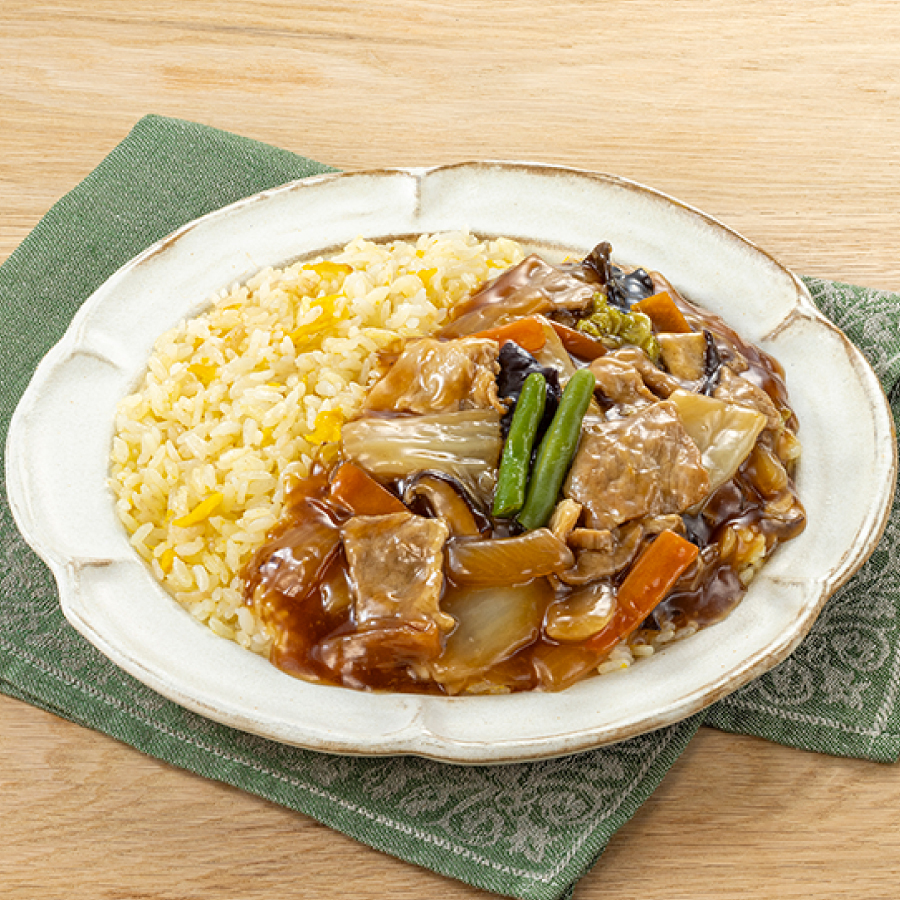 高温で調理できる専用設備を使い、野菜の香ばしさと食感が特長です。あんは醤油ベースに鶏ガラと北見市産椎茸を合わせた、旨味のある味わいが特長。あんの美味しさを引き立たせるシンプルな玉子チャーハンを組合せました。