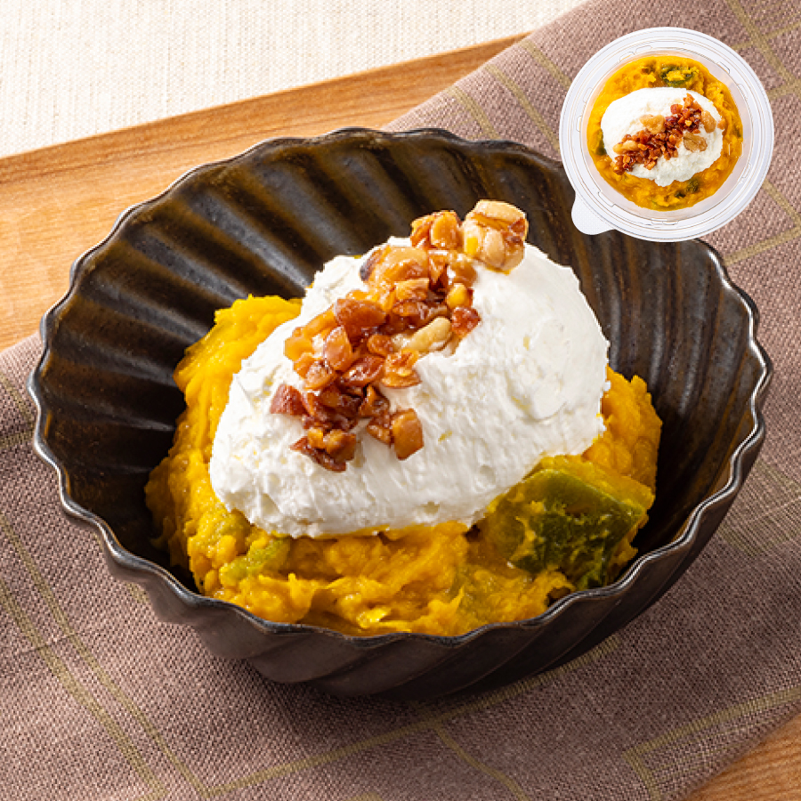 甘さと濃い味わいが特長の和寒町産かぼちゃを使用。クリームチーズを練りこんだ和寒町産かぼちゃにホイップクリームとナッツを盛り付けスイーツ風にしました。