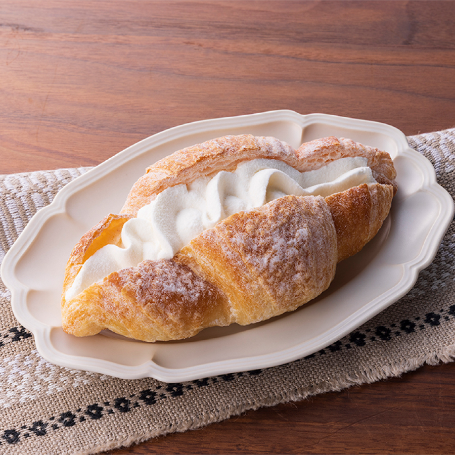 北海道産牛乳を使用したクロワッサンでホイップクリームを挟んだスイーツとしても楽しめる菓子パンです。ホイップクリームにも北海道産牛乳を配合し、濃厚なミルク感を味わえる仕立てとなっています。
