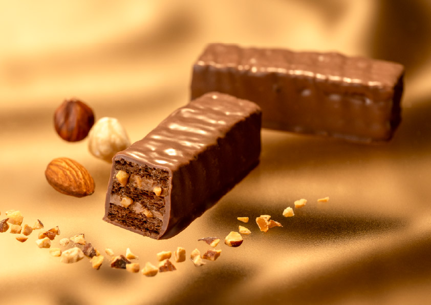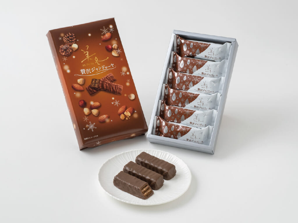 「美冬 贅沢ジャンドゥーヤ」は、ヘーゼルナッツとアーモンドのジャンドゥーヤフィリングをサクサクのココアパイでサンドし、くちどけなめらかなクーベルチュールのミルクチョコレートで包み込みました。今年は新たに、フィリングにアーモンドダイスが加わり、香ばしさと食感がパワーアップしました。口に入れた瞬間に広がるナッツの風味と空気の層を抱いたパイの食感をお楽しみください。