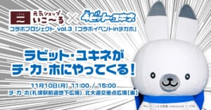 2026年2月に予定しているコラボ商品第3弾の発売に先駆けて、2025年11月10日(月)11時より、コラボ商品のお披露目を兼ねたプレイベントを、チ・カ・ホ 札幌駅前通地下広場 北大通交差点広場(東)で開催いたします。会場には11時と15時に『ラビット・ユキネ』が登場予定です。