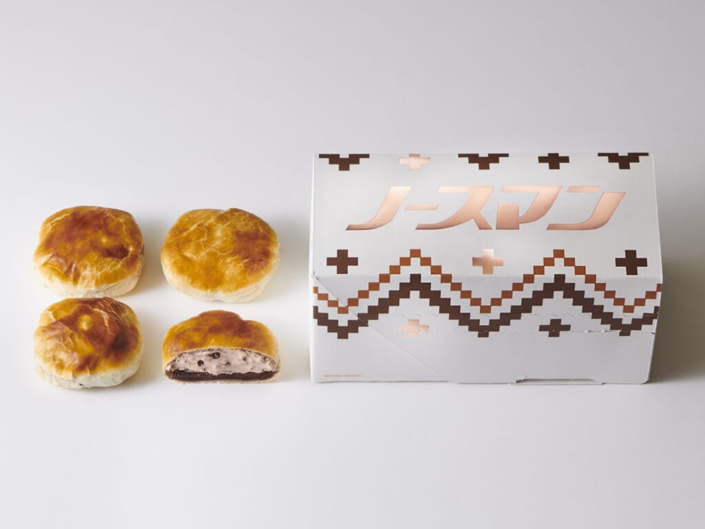 しっとりと焼き上げたパイ生地の中に、なめらかな口どけのチョコあんと、チョコレート生クリームをたっぷりと入れた「生ノースマン チョコレート」。チョコレートカラーでまとめられたシックな限定パッケージは、箔押しが上品に輝き、バレンタインなどの贈り物にも最適です。