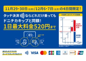 札幌市交通局では、2025年11月29日(土)、30日(日)、12月6日(土)、7日(日)の4日間限定で、クレジットカード等のタッチ決済で地下鉄を乗車した場合に限り、1日の乗車料金が520円を超えた場合でも自動的に520円(ドニチカキップ相当額)となるキャンペーンを実施します。