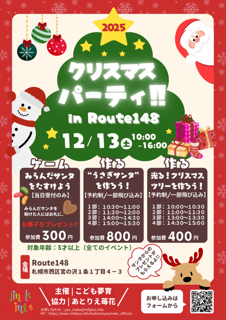 こども夢育が、宮の沢のRoute148にて「クリスマスパーティー」を12月13日(土)に開催!