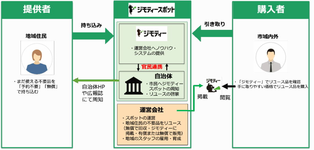 ジモティースポットは、「まだ使えるけれど不要になったモノ」を地域のコミュニティ内で譲り合うことが出来るサービスです。不要品を譲りたい方は予約なしで持ち込むだけで、次の必要とする人へつなぐことができます。譲り受けたい方は、地域の情報サイト「ジモティー」で商品情報を確認し、店舗で実物を見て購入・引き取りが可能です。