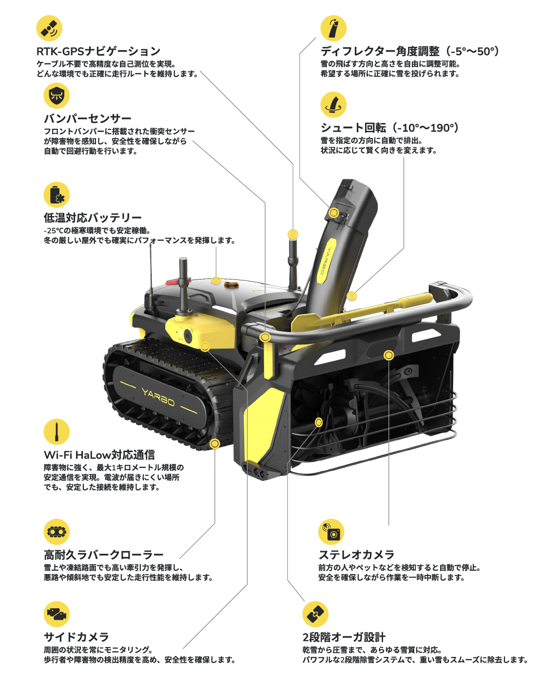 実証試験では、米国で1万台以上の納入実績を持つ除雪ロボット「Yarbo」を使用し、積雪下での走行性能・投雪能力・運用性を評価します。Yarboは2025年12月より国内販売が開始され、電波法など必要な認可を取得した正式モデルを用いた試験となります。