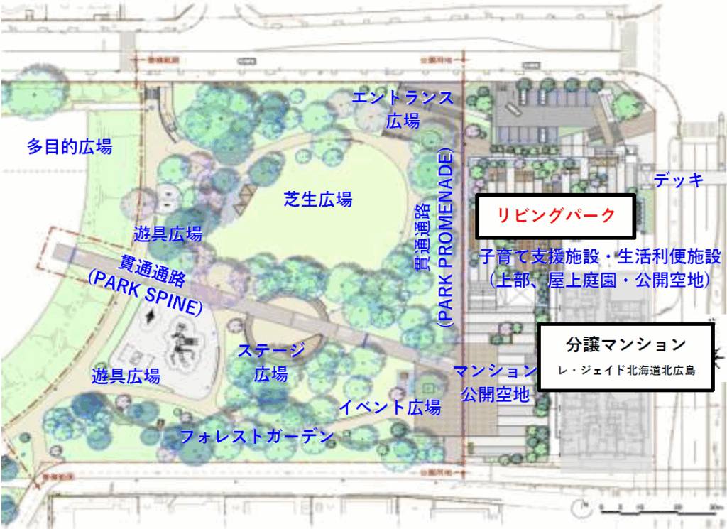 北広公園は、リニューアル後にはペデストリアンデッキや「tonarie 北広島」のテラス、「レ・ジェイド北海道北広島」の公開空地を経由することで、地上へ降りずに駅からアクセス可能となります。
