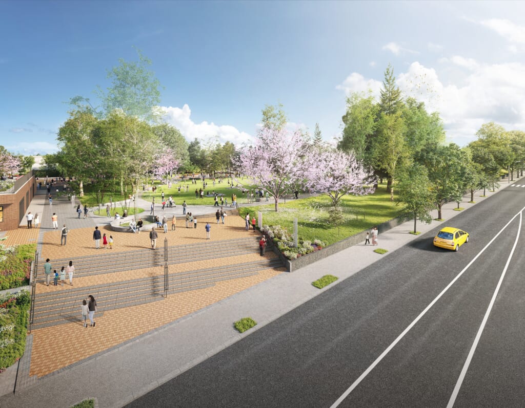 北広公園は、約50年前に北広島団地造成時に北海道によって整備された公園であり、駅西口から約200mとアクセスに優れ、市民に親しまれてきました。一方、年月の経過により樹木が生い茂り、施設の老朽化が進んだ結果、公園の魅力やポテンシャルが十分に発揮できていないという課題を抱えています。そこで、公園が身近にあるライフスタイルによって暮らしの質を向上させるべく、リニューアルします。また、北広島市の玄関口にふさわしい、市民や観光客などに幅広く親しまれる公園を目指します。リニューアルオープンは2026 年11 月を予定しており、「レ・ジェイド北海道北広島」の引渡しと同時期となります。