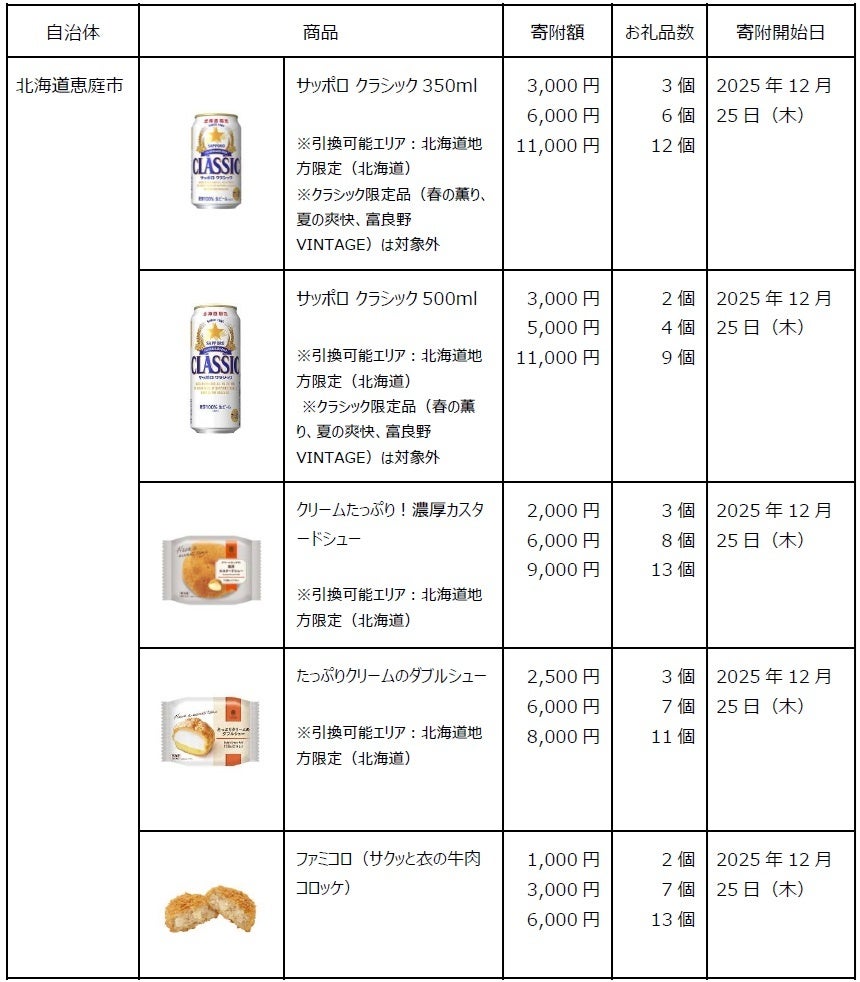 年末にかけてふるさと納税の需要が高まっている中、このたび、恵庭市で製造されているおかずにもぴったりの「ファミコロ(サクッと衣の牛肉コロッケ)」や、北海道限定で引換できる「たっぷりクリームのダブルシュー」、「サッポロ クラシック350m/500ml」など、5商品を追加します。