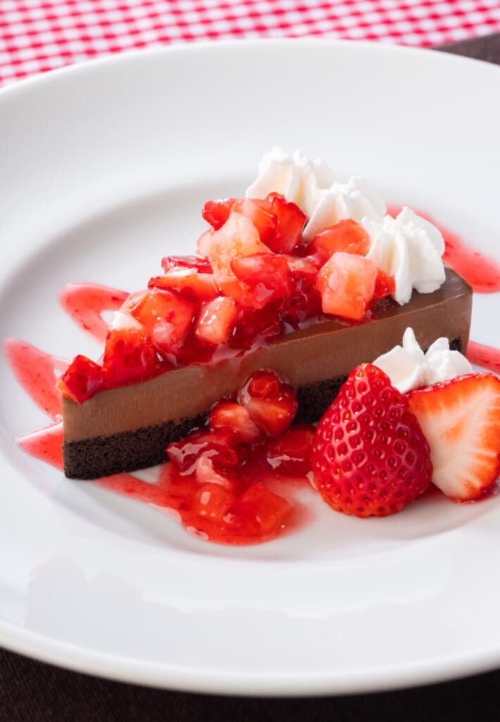今年の『いちごフェア』では、「苺チョコアイスケーキ」が新たに登場します。ストロベリーソースに絡めたいちごを、ほろ苦く濃厚なチョコアイスケーキの上にたっぷりとのせた当メニューは、華やかな見た目で、目でも楽しめるメニューです。旬の甘酸っぱいいちごと、口の中でとろける生チョコのような味わいのチョコアイスケーキを堪能できます。