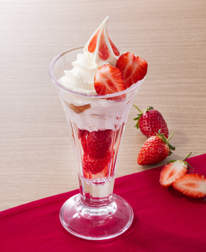 新鮮な旬の国産いちごをたっぷり味わっていただけるよう、6粒のいちごを使用した豪華なパフェです。いちごをごろっとグラスに入れ、ホイップクリームとざくざく食感のワッフルコーン、上には牛乳本来の甘さを引き立てた北海道牛乳ソフトと、程よい酸味のストロベリーソースをかけました。