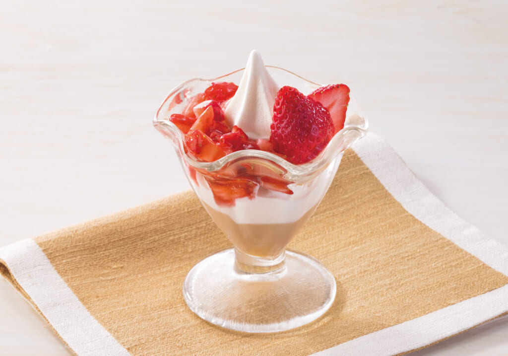 北海道恵庭の自社工場で作る、優しい甘さのやわらかいロイヤルミルクティープリンの上に、北海道牛乳ソフトといちごを盛り付けました。すっきりとした甘さが食後のデザートにおすすめです。