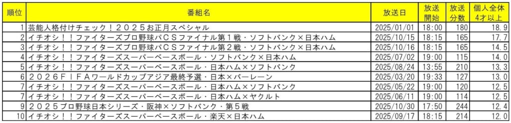 【個人全体】 2025年HTB高視聴率番組 TOP10