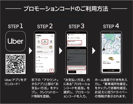 - 利用条件:プロモーションコード【CTSAIR25】をアプリ内で入力のうえ、Uber Taxiの配車を完了すること(アプリをすでにインストールしている場合は、こちらのリンクから遷移することで、プロモーションコードの手動入力は不要となります)
