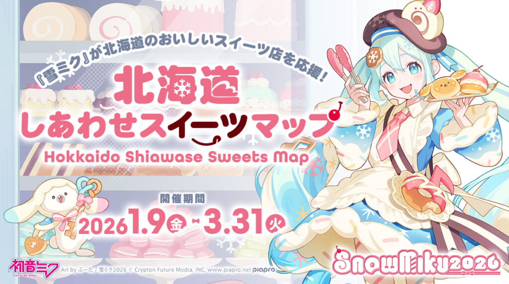 クリプトン・フューチャー・メディア株式会社は、北海道を応援するキャラクター『雪ミク』のフェスティバル「SNOW MIKU 2026」の一環として、道内各地のスイーツ店とコラボレーションする企画「北海道しあわせスイーツマップ」(協力:札幌洋菓子協会/スイーツ王国さっぽろ推進協議会)の展開を開始しました。