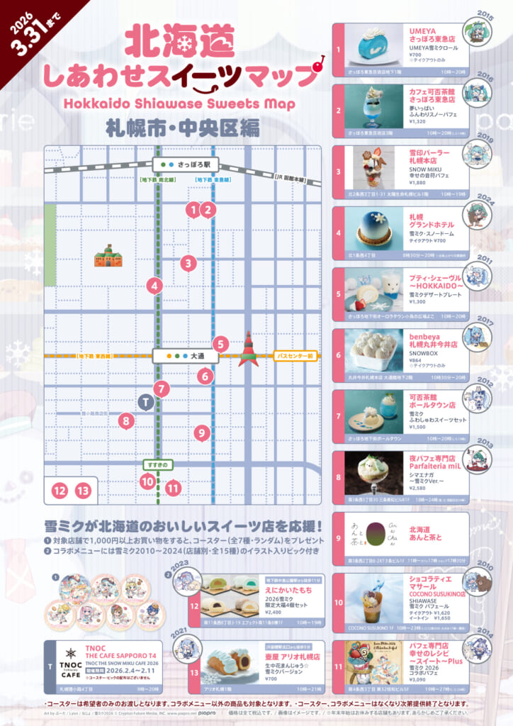 札幌市内の13店をはじめ、小樽市内の2店、函館市内の4店、さらには標茶町内の1店を加えた計20店舗が参加している、スイーツ店応援企画です。2026年1月9日(金)~3月31日(火)まで、参加店舗でのお会計が1,000円以上の方にコースター(全7種・ランダム)をお渡しするほか、一部店舗では『雪ミク』のイラスト入りピックが付いたコラボメニューも提供します。
