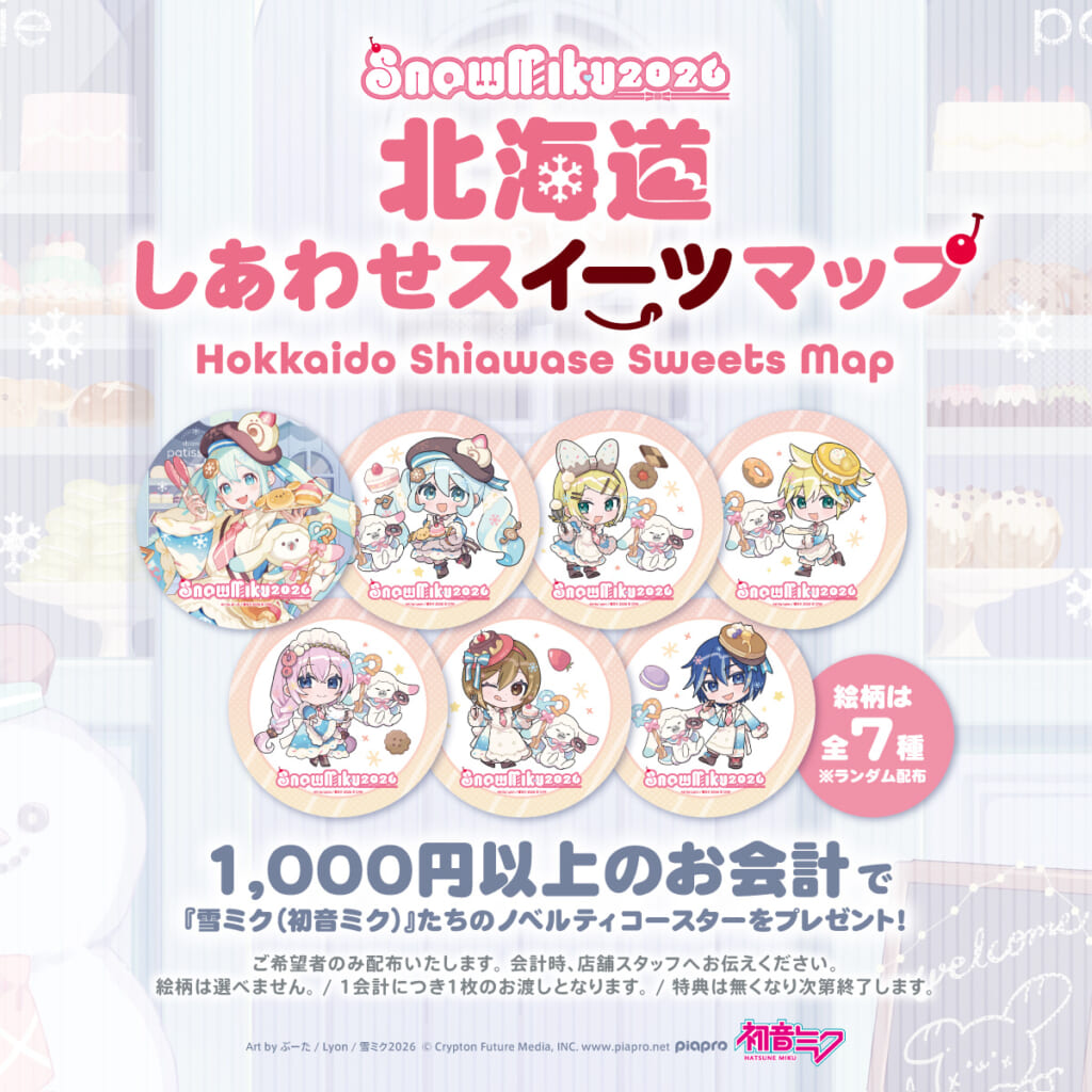 今回のコラボレーション企画「北海道しあわせスイーツマップ」では、「SNOW MIKU 2026」のイベントテーマが「しあわせパティスリー」であることから、雪ミクとユキネが北海道のおいしいスイーツ店を応援。コラボレーション期間中は、本企画に参加を表明した道内20店舗で、1会計税込み1,000円以上のお買い物をされた方に、ぶーたさん、Lyonさんによる「SNOW MIKU 2026」描き下ろしイラストを使用したコースター(全7種)をランダムでお渡しします。