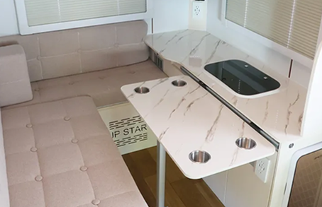ハッピーワンプラスは、軽自動車をベースにしたコンパクトサイズのキャンピングカーで、初めてキャンピングカーを利用する方でも安心して運転できる点が大きな魅力です。小回りが利くため、北海道の街中から細い道、観光地までストレスなく走行できます。車内は軽キャンとは思えないほど効率的に設計されており、最大4名まで乗車・就寝が可能です。家族や友人同士の旅行にも対応できる十分な居住性があり、荷物収納スペースも確保されています。
