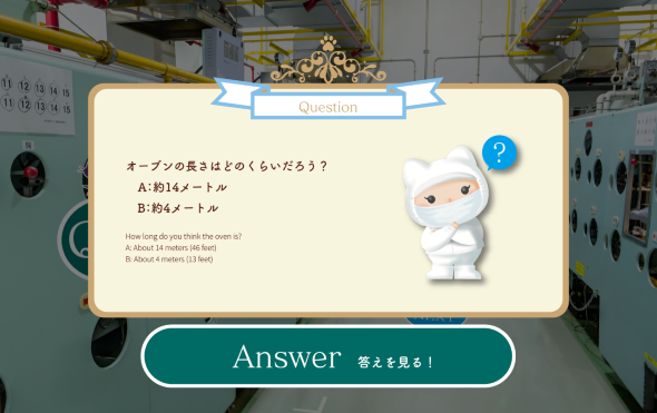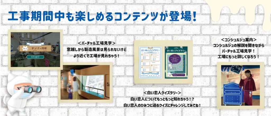 工事期間中も白い恋人パークを楽しめるよう常駐する【コンシュルジュの解説】や、【360度見渡せるバーチャル工場見学】、さらに、【白い恋人クイズラリー】を実施。バーチャル工場見学では、これまで非公開とされていた工場の奥も観ることができます。