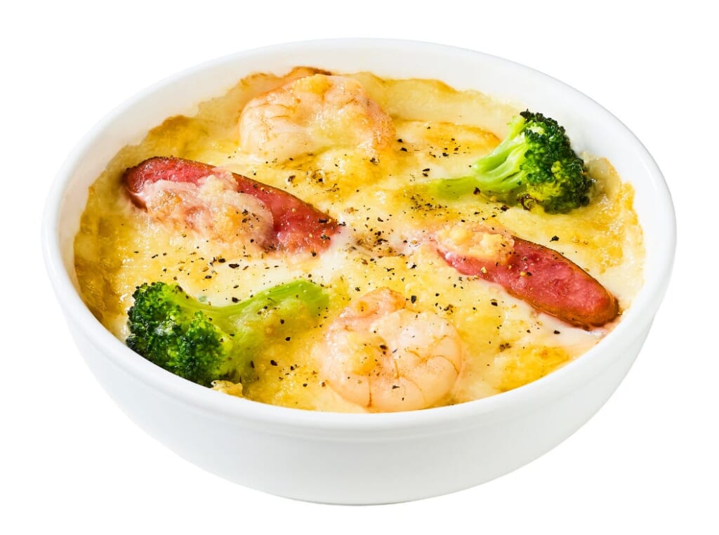 濃厚なラクレットチーズとエビ、ソーセージ、ブロッコリーをトッピング!まるでチーズフォンデュのようなドリアです。