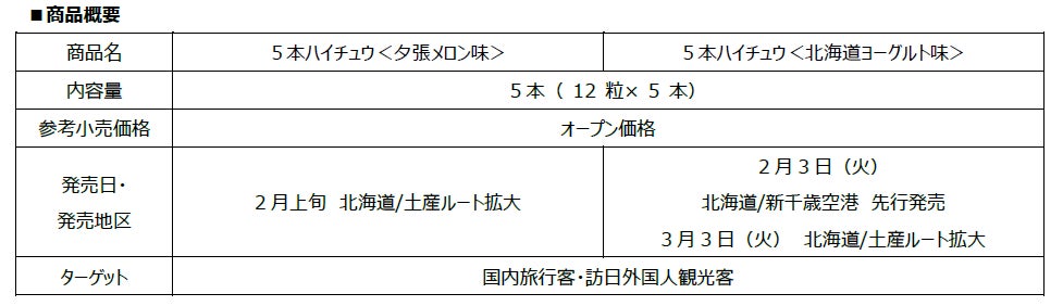 森永製菓株式会社は、日本各地の名産を使用した地域限定シリーズ「おみやげハイチュウ」から、「5本ハイチュウ<北海道ヨーグルト味>」を2月3日(火)より北海道新千歳空港売店にて先行発売し、3月3日(火)より北海道の土産物ルートで発売します。また、「5本ハイチュウ<夕張メロン味>」を2月上旬よりリニューアル発売します。