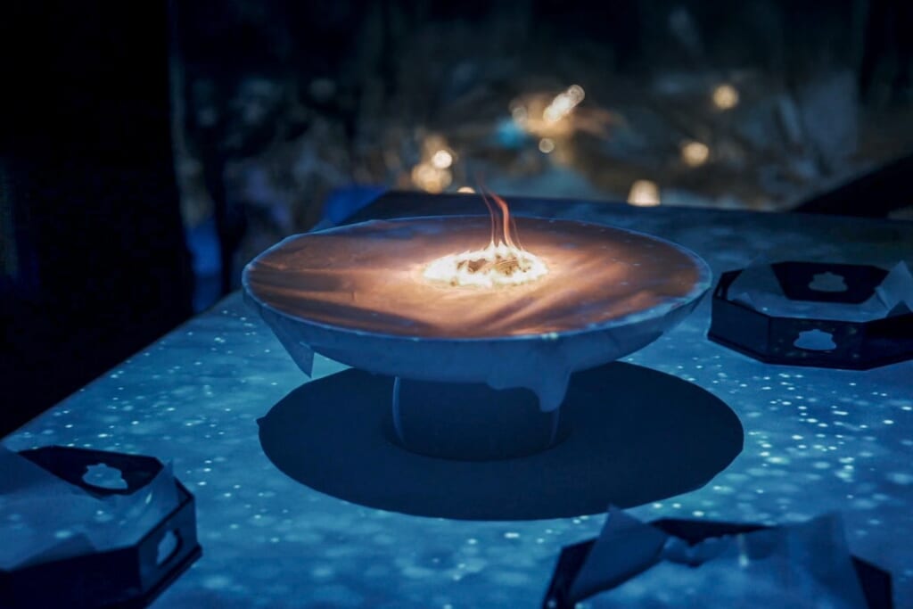 店内のメインダイニングでは、デジタルアートがテーブルを彩ります。戦後から現代まで、エルムガーデンが歩んだ北海道の80年の食文化の歴史を、旬の食材を使用した日本料理で表現し、プロジェクションマッピングが物語への没入感を演出します。