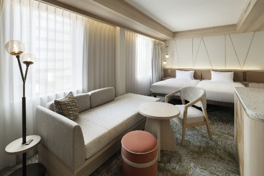 グループやファミリーでの利用の増加等、ニーズの多様化に対応するため、客室は全7タイプ・177室へと刷新。既存の 2室を1室に再構成し、3~4名で宿泊できる客室も20室から140室へ大幅に増設しました。内装や家具、備品も一新し、客室は落ち着いたデザインでまとめ、札幌の自然をイメージしたデザインをアクセントとしてミニバーに取り入れています。客室サインには、北海道の伝統的な手法で作った工芸品である優佳良織(ゆうからおり)を用いました。さらに、全客室の水回り設備も一新し、より快適で清潔感のある滞在を楽しめます。