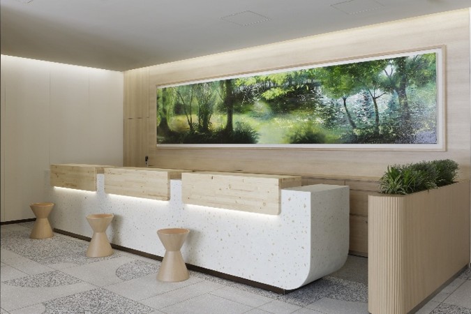 エントランスには美瑛町所在の「青い池」、ロビーには赤レンガ庁舎の庭や池をモチーフにした迫力のあるアートを配置するなど、北海道や札幌のローカリティを感じられる空間へと全面刷新しました。また、ロビーラウンジの内装・家具を一新し、植栽と調和した空間を創出しています。ゲストとホテルの最初の接点であるレセプションカウンターの天板には三井不動産グループ保有林の間伐材を利用し、木のぬくもりとともにゲストを温かくお迎えします。