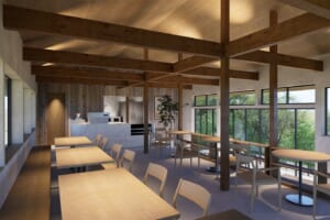 その開かれた空気感を受け継ぎながら、今回カフェとして改装。北海道産の木材をふんだんに使用した建築は、周囲の森や風景と穏やかに呼応し、屋内にいながらも自然の気配を感じられる空間となっています。