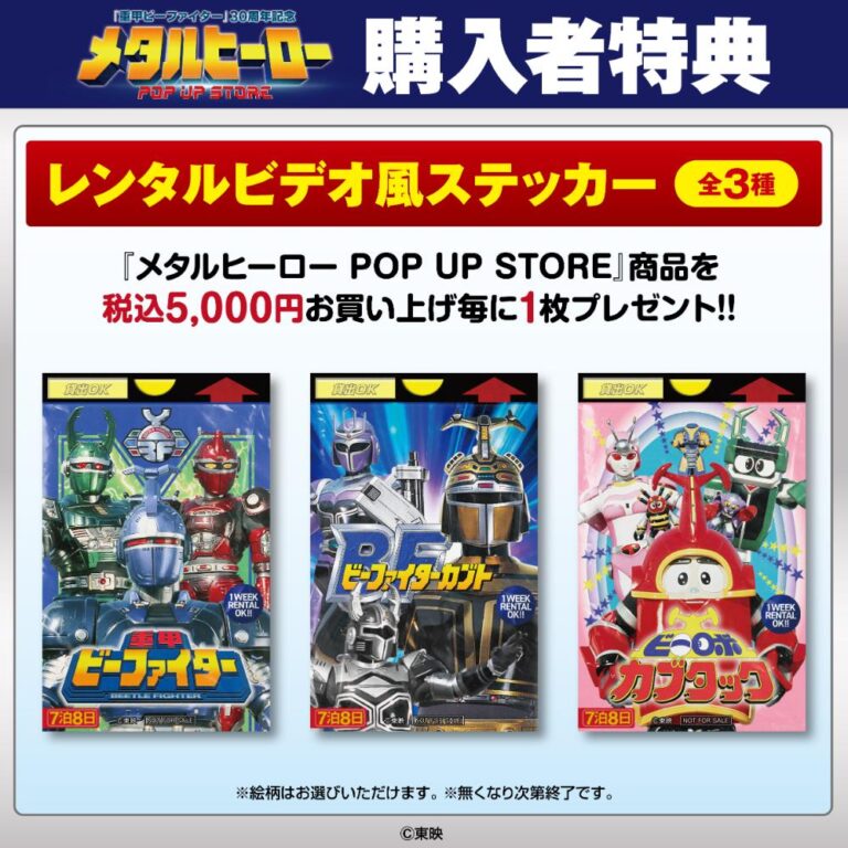 ※イベント開催期間中「メタルヒーローシリーズ関連商品(一部除く)」のご購入5,000円(税込)毎に1枚、「レンタルビデオ風ステッカー」をプレゼント。(無くなり次第終了)