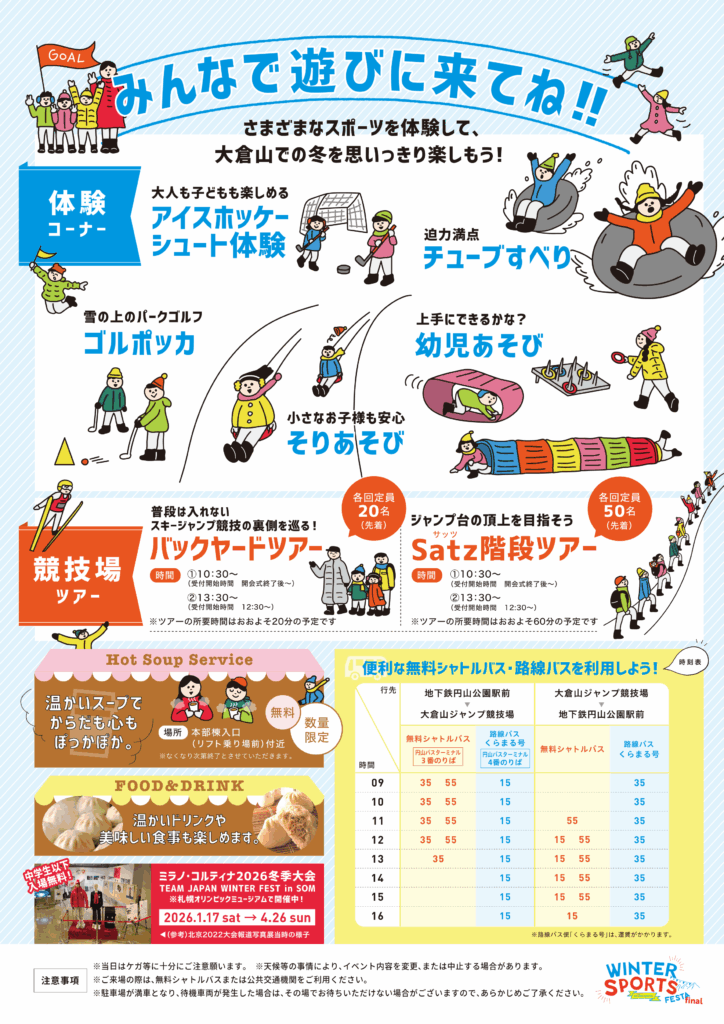 大倉山ジャンプ競技場では2月15日(日)に気軽にウインタースポーツを楽しめるイベント「ウインタースポーツフェスタin大倉山ファイナル」を開催します。