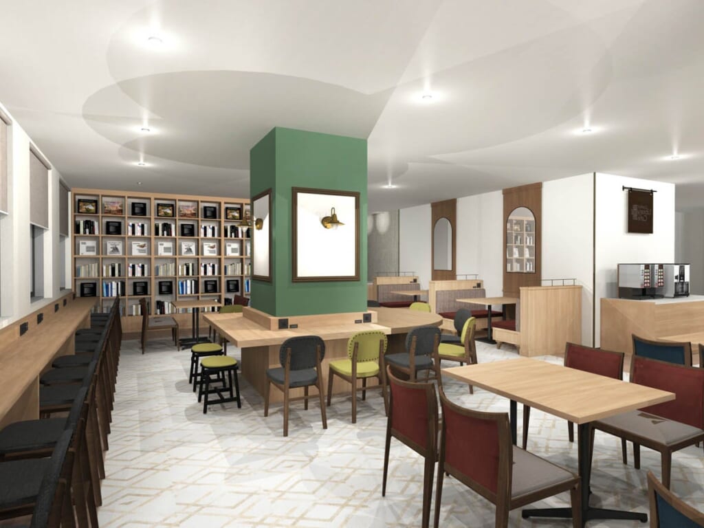 ホテル1階には、宿泊者が無料で利用できるオープンスペース「Comfort Library Cafe(以下、ライブラリーカフェ)」を併設します。