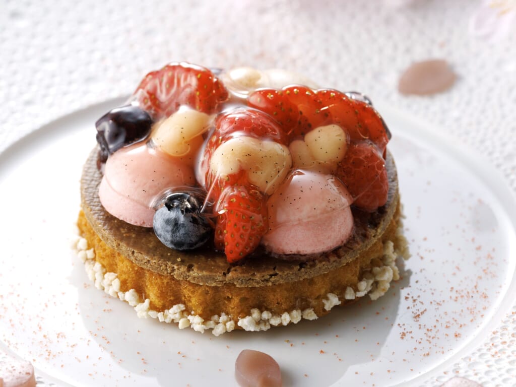 カルダモン香るしっとりと焼き上げたパンドジェーヌに、桜風味のクリーム、白桃や苺のムースを重ねた、今季限定のスイーツです。